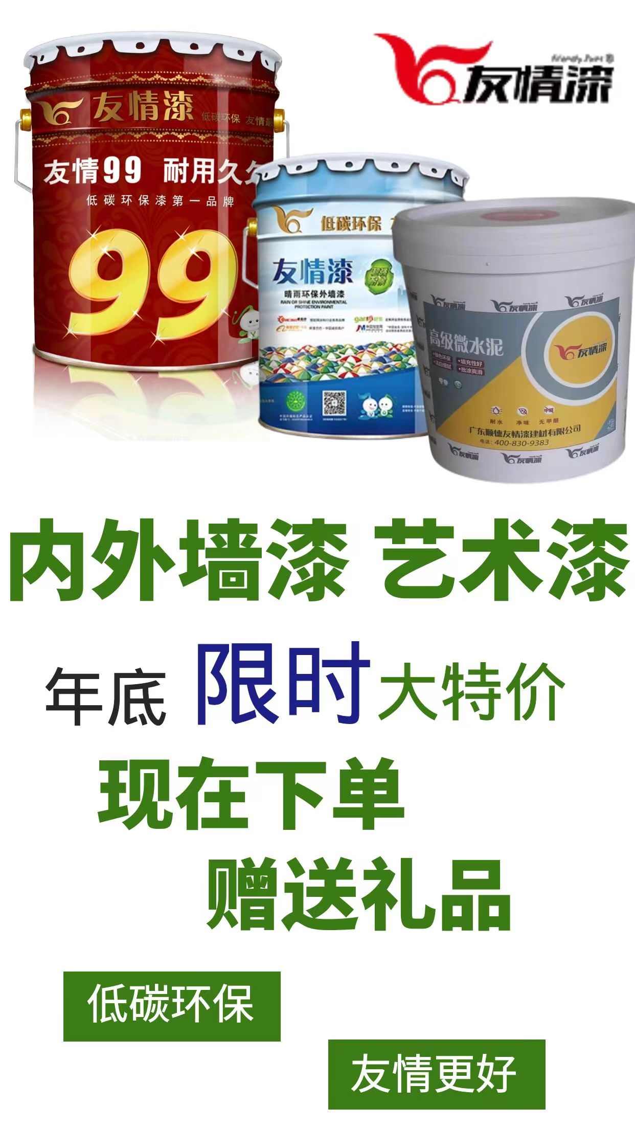 在這樣一個形勢大好的年終歲末,友情漆順勢而動,推出內墻乳膠漆、外墻乳膠漆、藝術漆這3個品種,進行特價活動,支持各地的復工建設。