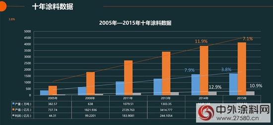 隨著過去十幾年中國城市化進(jìn)程的飛速發(fā)展,中國涂料工業(yè)的高速發(fā)展,總體受益于房地產(chǎn)、家具等行業(yè)的快速發(fā)展。過去十年,中國涂料行業(yè)快速發(fā)展,實(shí)現(xiàn)了11.16%的年復(fù)合增長率。但是,隨著中國經(jīng)濟(jì)逐步放緩,過去十幾年拉動涂料行業(yè)發(fā)展的主要動力——房地產(chǎn)、家具行業(yè)的忽冷忽熱,止步不前,中國涂料行業(yè)亦面臨增速放緩難題,中國涂料工業(yè)如何穩(wěn)步發(fā)展,亦是思考。
