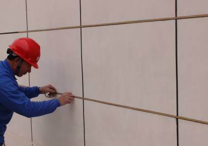 膩?zhàn)邮┕ね辏克⒖箟A封閉底漆后,可進(jìn)行分格縫工序。根據(jù)設(shè)計(jì)的分格大小,用彈線的方式在墻面上畫分格。