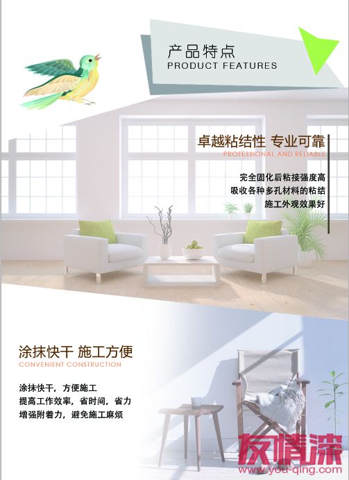 白乳膠是用途最廣、用量最大、歷史最悠久的水溶性膠粘劑之一,是由醋酸乙烯單體在引發(fā)劑作用下經(jīng)聚合反應(yīng)而制得的一種熱塑性粘合劑。可常溫固化、固化較快、粘接強度較高,粘接層具有較好的韌性和耐久性且不易老化。經(jīng)過環(huán)保無害化處理的友情漆白乳膠,更適合當(dāng)今綠色家居裝修的需求。